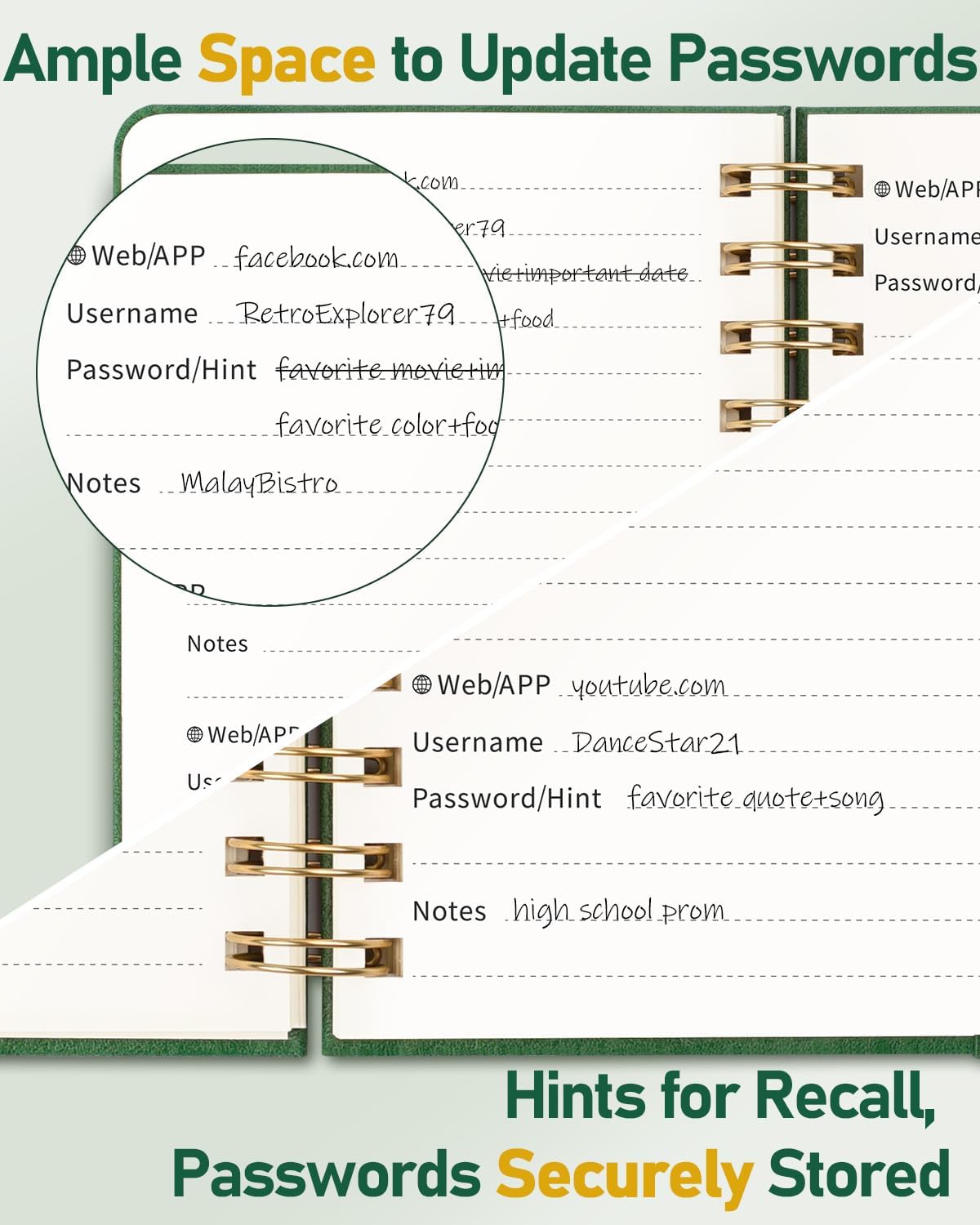 Master your passwords with Alphabetical Tabs: 24 sections, each storing up to 18 passwords; Ample writing space to update and secure passwords; Add personal hints and notes for extra security; # Index tabs for frequently used passwords; Plus, lined note pages for convenient note-taking