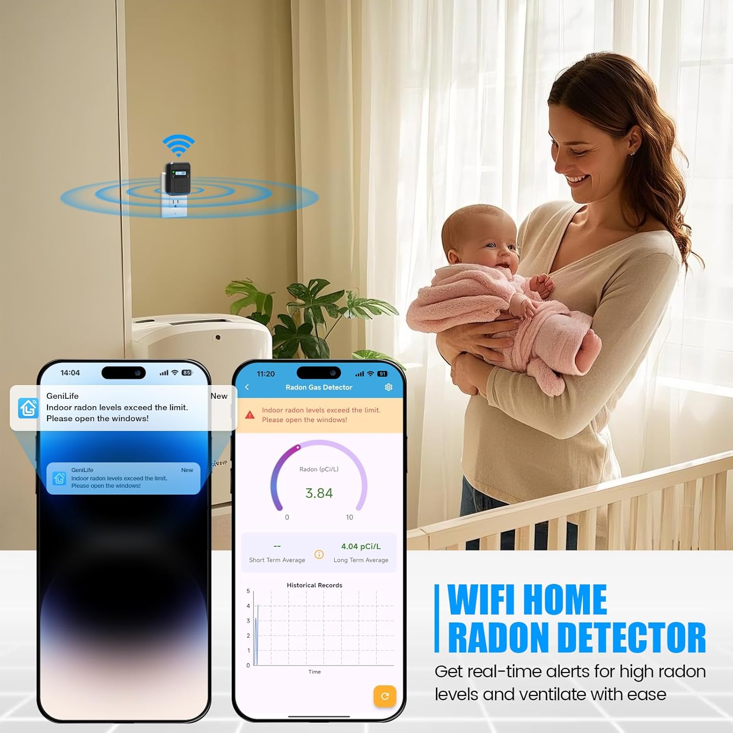 The new-generation radon detector features WiFi control functionality, allowing you to view radon reports anytime, anywhere through the GeniLife app. Effortlessly track both short-term and long-term radon fluctuations, keeping your family’s health. Supports 2.4G WiFi and 5G WiFi