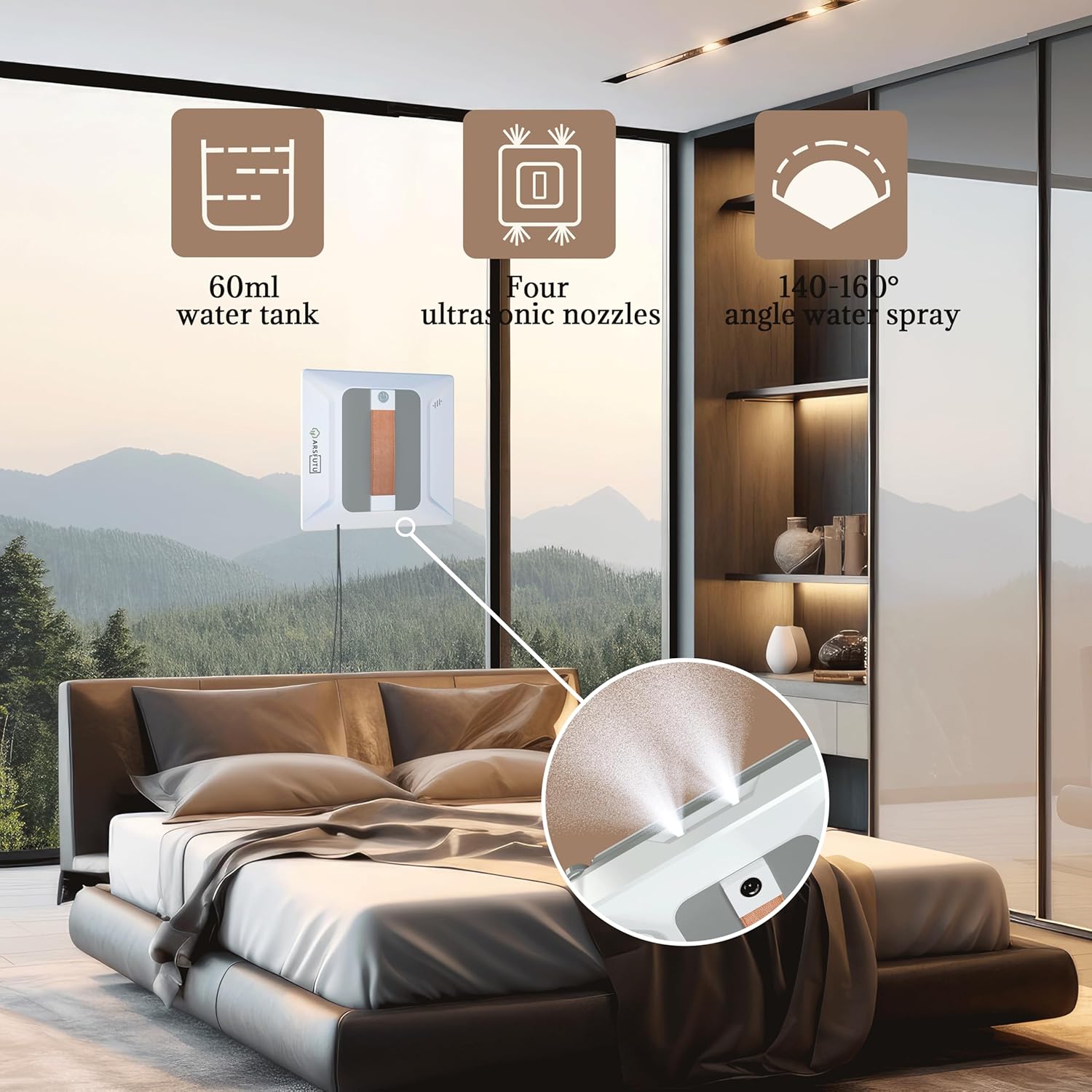 4 Upgraded Water Spray Nozzles: Featuring four 140-160° wide-angle ultrasonic spray nozzles, the winbot provides ample water spray to effortlessly clean large floor-to-ceiling windows. The nozzles are capable of evenly distributing water across the glass surface, ensuring comprehensive coverage and deep cleaning.