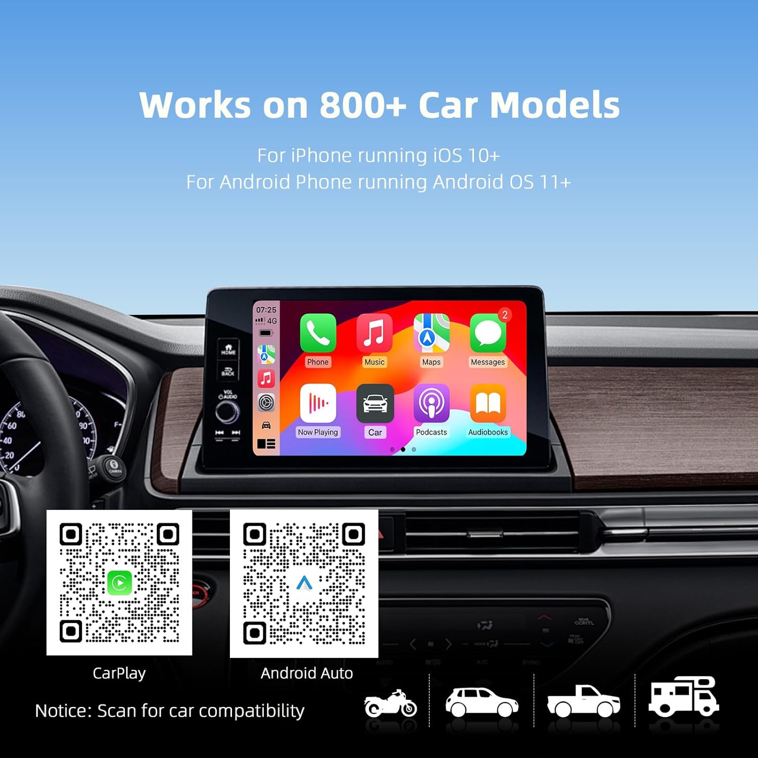 【Compatible Vehicles Above 2017】 Works on more than 800+ car models come with wired CarPlay or Android Auto above 2017. If you are not sure if your car supports wired CarPlay, please check the QR code in the picture or contact our Support. We will get back to you soon.