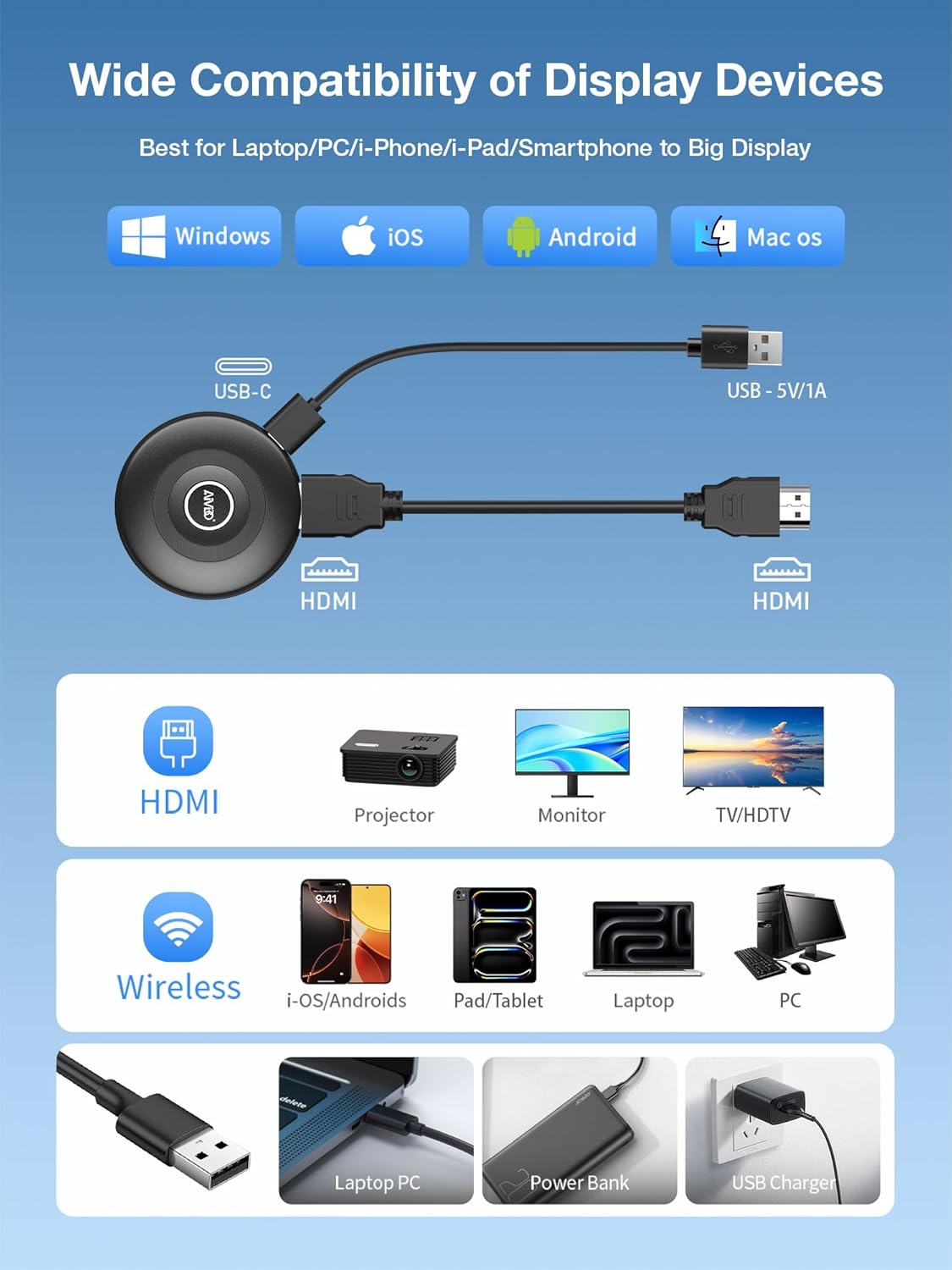 【True 4K Output Wireless】Newly upgraded wireless display adapter uses a 4K HDMI dongle and 4K HDMI cable, guaranteeing the delivery of 4K input during video streaming with genuine 4K high-fidelity Ultra HD output. This HDMI wireless display dongle allows you to wirelessly sync the small screens of smartphones, tablets, laptops, and computers to the large screens of TVs, HDTVs, monitors, or projectors, so that you can share every vivid moment with family and friends in an uncluttered space, all while safeguarding your eyesight.