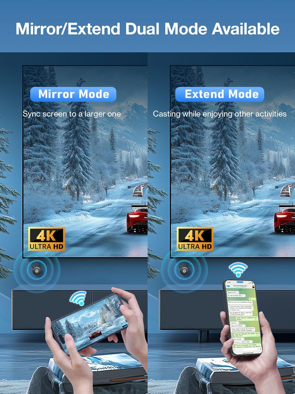 【Flexible Dual Screen Mode】In Mirror Mode, the wireless hdmi dongle effortlessly casts audio, videos, movies, images, photos, files, games, and apps to the big screen. In Extend Mode, you can do multitasking and expand your working area with the HDMI Wireless Extender. It is perfect for presenting on the monitor while continuing to work on the laptop. Our miracast dongle also allows browsing your phone while projecting through the app’s internal screen projection function.