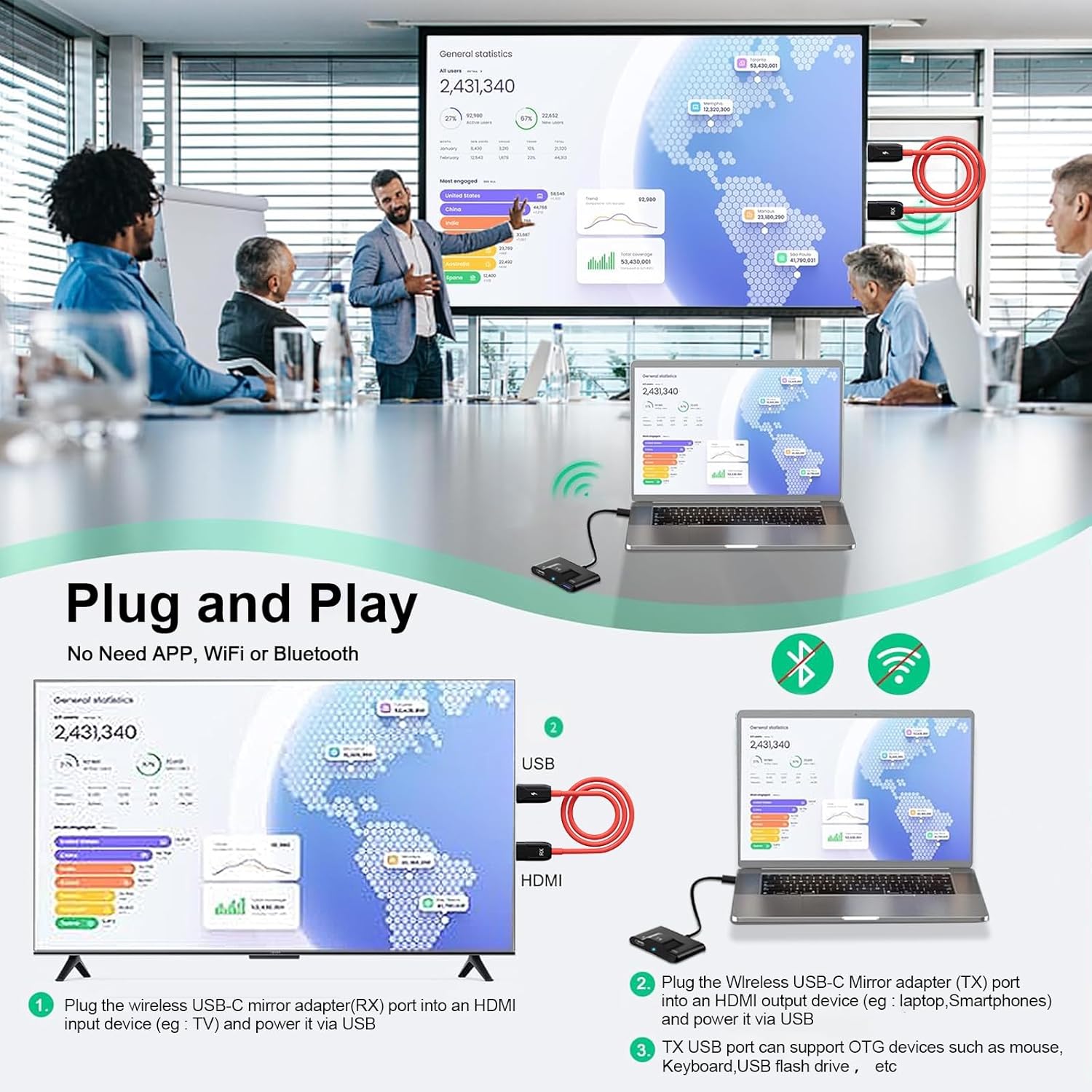 【Wide Compatibility】Wireless HDMI Extender Kit provides hdmi connector and Type-C adapter for use .The USB-C mirror adapter (TX) port is compatible with most HDMI output devices, such as laptops, desktop computers, mobile phones, monitors,etc. In addition, the USB interface of the TX port supports OTG devices such as mouse, keyboard, USB flash drive, etc. Ideal for It is suitable for church TV, conference video, home audio and video, outdoor parties, outdoor performances, school activities, etc