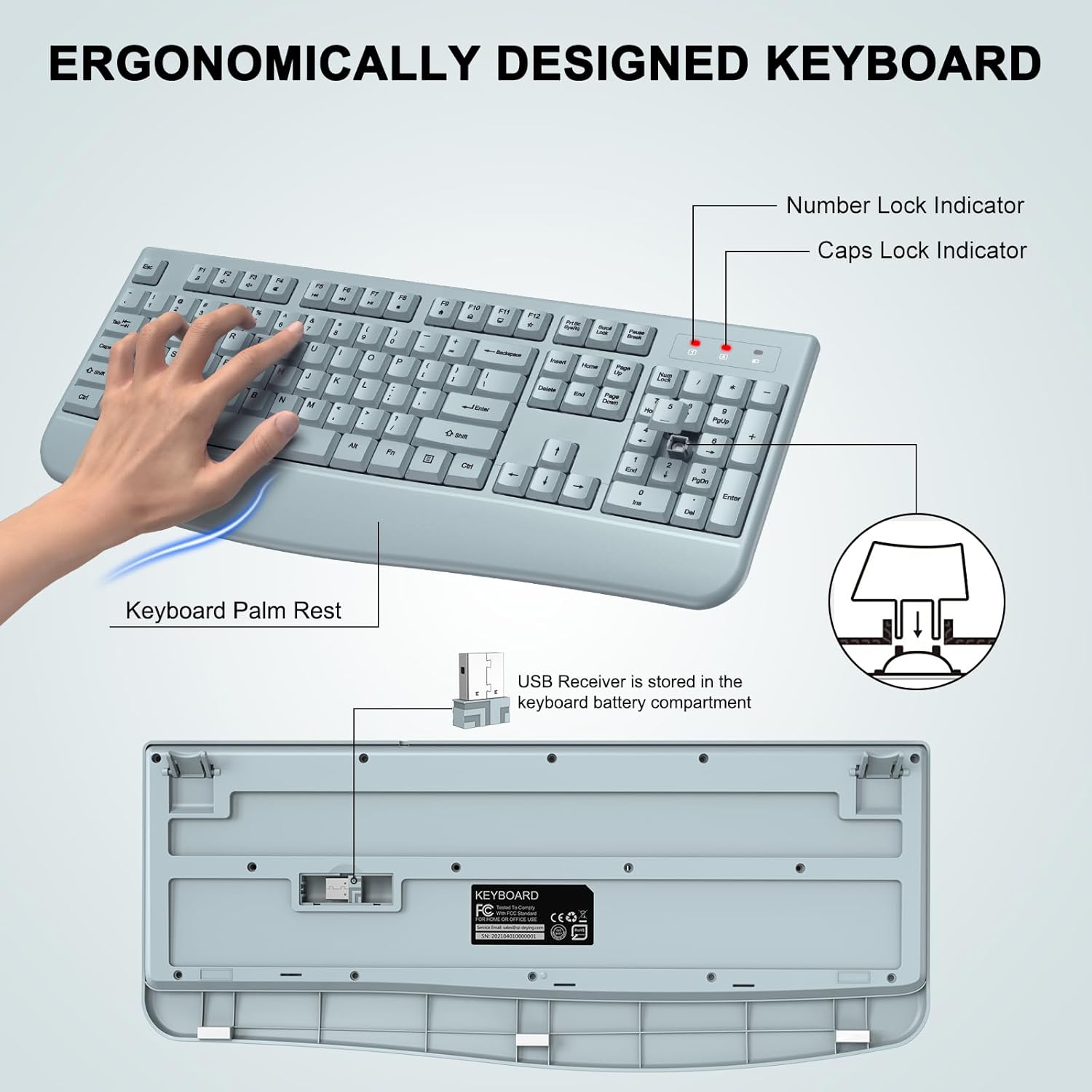 【ERGONOMIC WIRELESS KEYBOARD MOUSE COMBO】ULSOU Full-sized wireless keyboard is ergonomically designed with Palm Rest and folding holder that can keep it at an optimum slope,prevent your wrists from hurting while long sessions of typing. Keyboard is also designed with anti-slide pads so it will stay in place when you’re typing quickly. NOTE: THE USB RECEIVER IS IN THE BATTERY COMPARTMENT OF THE KEYBOARD, YOU CAN FIND IT WHEN OPEN THE KEYBOARD BATTERY COVER.