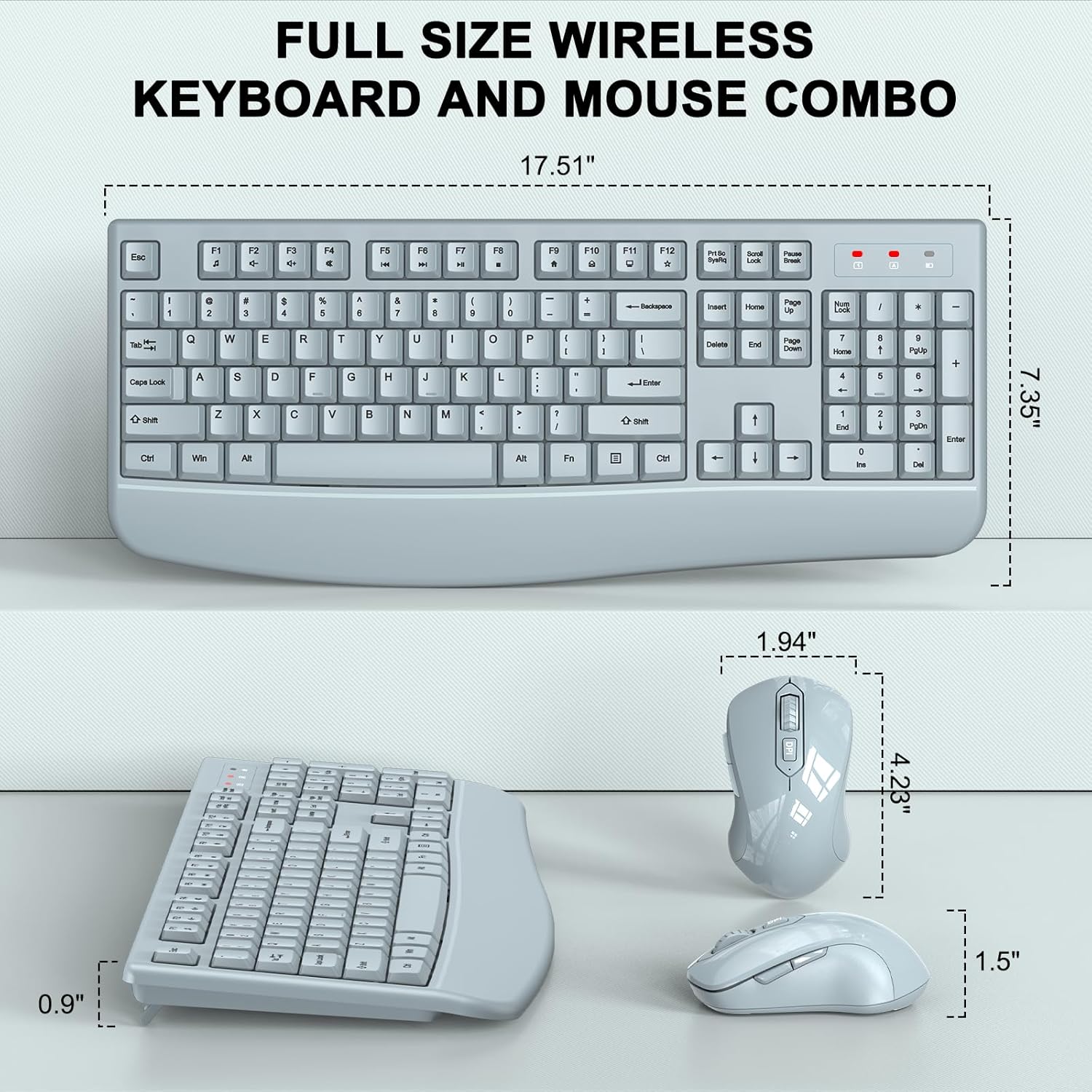 Wireless Keyboard and Mouse Combo, ULSOU 2.4G Full-Sized Ergonomic Computer Keyboard with Wrist Rest and 3 Level DPI Adjustable Wireless Mouse for Windows, Mac OS Desktop/Laptop/PC(Grey)