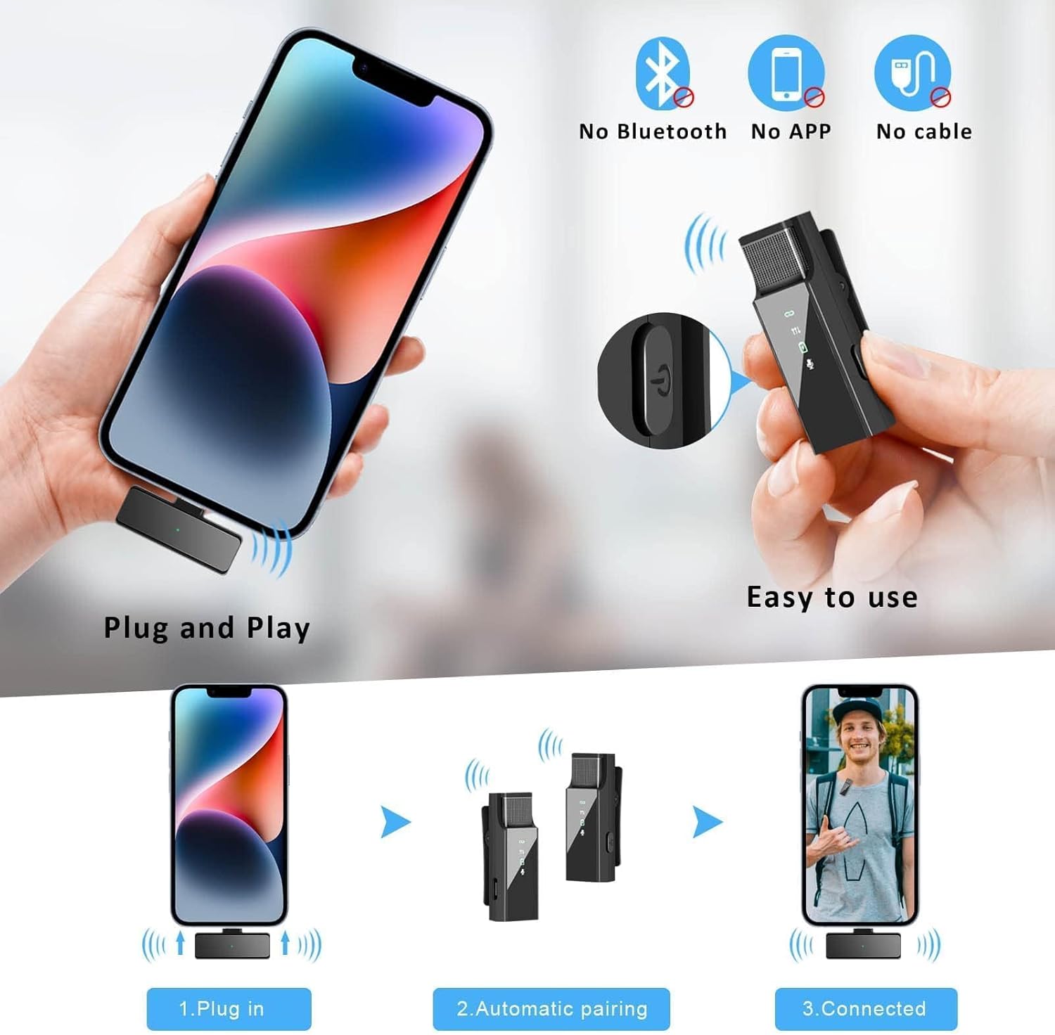 PLAG AND THEN PLAY: NO steps about bliuetooth connecting.NO requirement of operating apps or 3.5mm interface which is rare in recent mobilephones. NO worries abuot mess when using traditional wired mic.Just plug the receiver into your device and turn on the portable microphone, two parts will pair automatically to set up.Supporting iPhone 16/pro/promax.