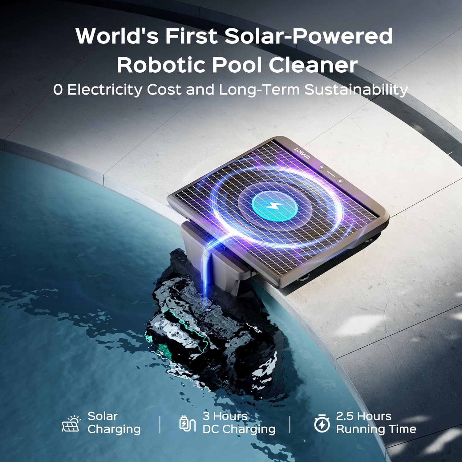 World’s First Underwater Solar-Powered Pool Cleaner: After the solar panels receive a full day’s worth of sunlight, the machine can come to run for 1.5 hours. It DC charges for 3 hours and can run for up to 2.5 hours. Automatically returns to the base for charging, ensuring hassle-free operation.