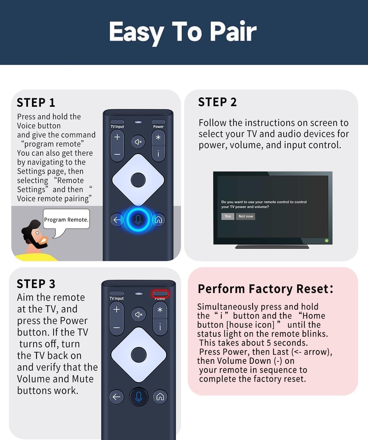 【Pair the XR16 Remote to Control a TV or audio device】: This will allow you to control your television’s power, volume and input from the XR16 remote. 1. Press and hold the Voice button and give the command “program remote“. You can also get there by navigating to the Settings page, then selecting “Remote Settings“ and then “Voice remote pairing.“ 2. Follow the instructions on screen to select your TV and audio devices for power, volume, and input control. 3. Aim the remote at the TV, and press the Power button. If the TV turns off, turn the TV back on and verify that the Volume and Mute buttons work.