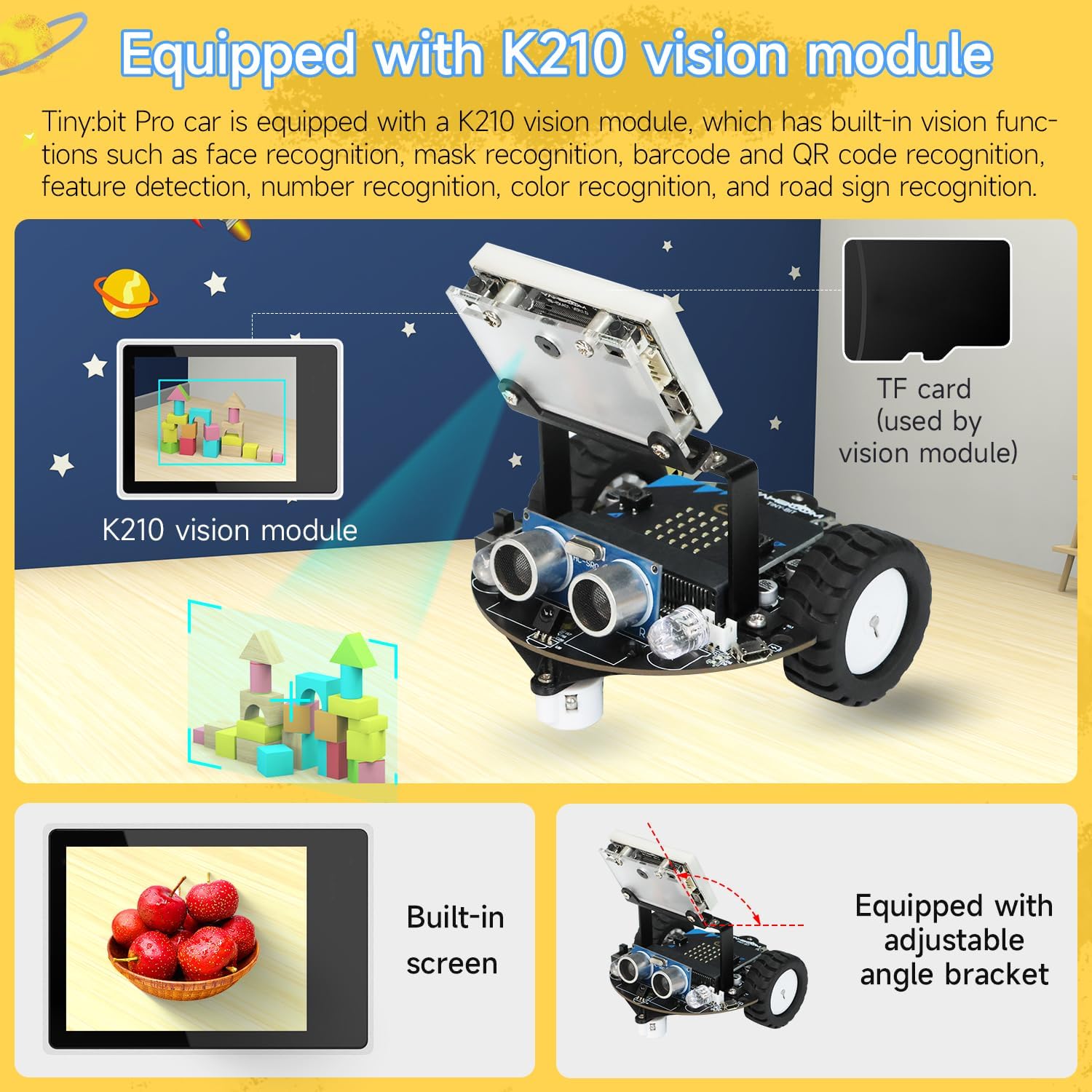 Fully upgraded AI vision function: Tinybit Pro is equipped with K210 vision module with built-in functions of face recognition, barcode recognition, feature detection, and digital face landmark recognition. Based on this powerful visual function, children can complete their own creative experiments and quickly experience The fun of AI vision and autonomous driving.