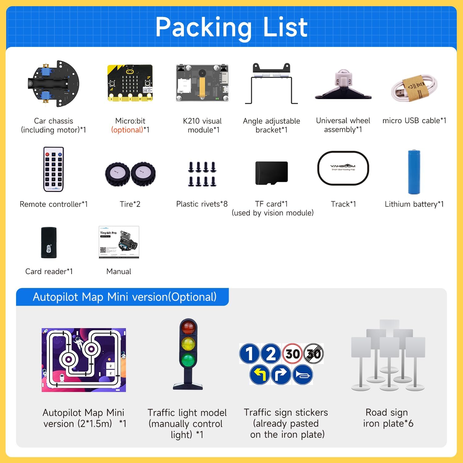 Autopilot map: The Expansion version is equipped with a 2m*1.5m autopilot map and traffic signs, and manually adjusted red street light cameras. Tinybit Pro can quickly identify traffic signs and quickly realize corresponding operations. Note: The automatic driving on the map is infrared sensor line inspection, not visual line inspection.