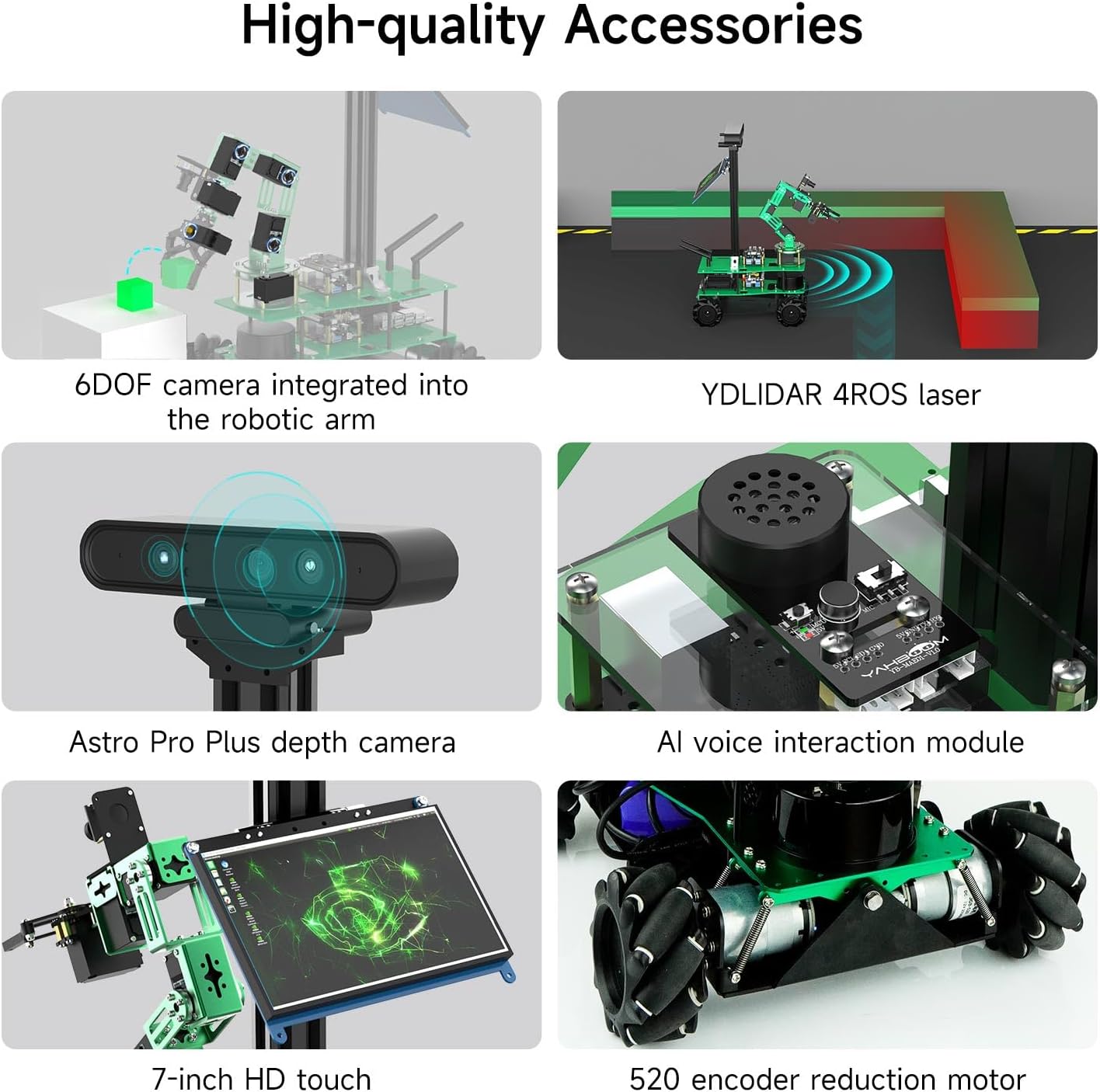 Flagship configuration: ORBBEC Astra Pro depth camera, high-definition touch adjustable 7-inch screen, 6-DOF robotic arm with camera AI camera, YDLIDAR 4ROS TOF ranging lidar, 80mm large-size Mecanum wheel, 520 Hall coding Geared motor, 9600MAH lithium battery pack, epoxy color road alloy body structure. All accessories will bring you the ultimate programming and control experience.