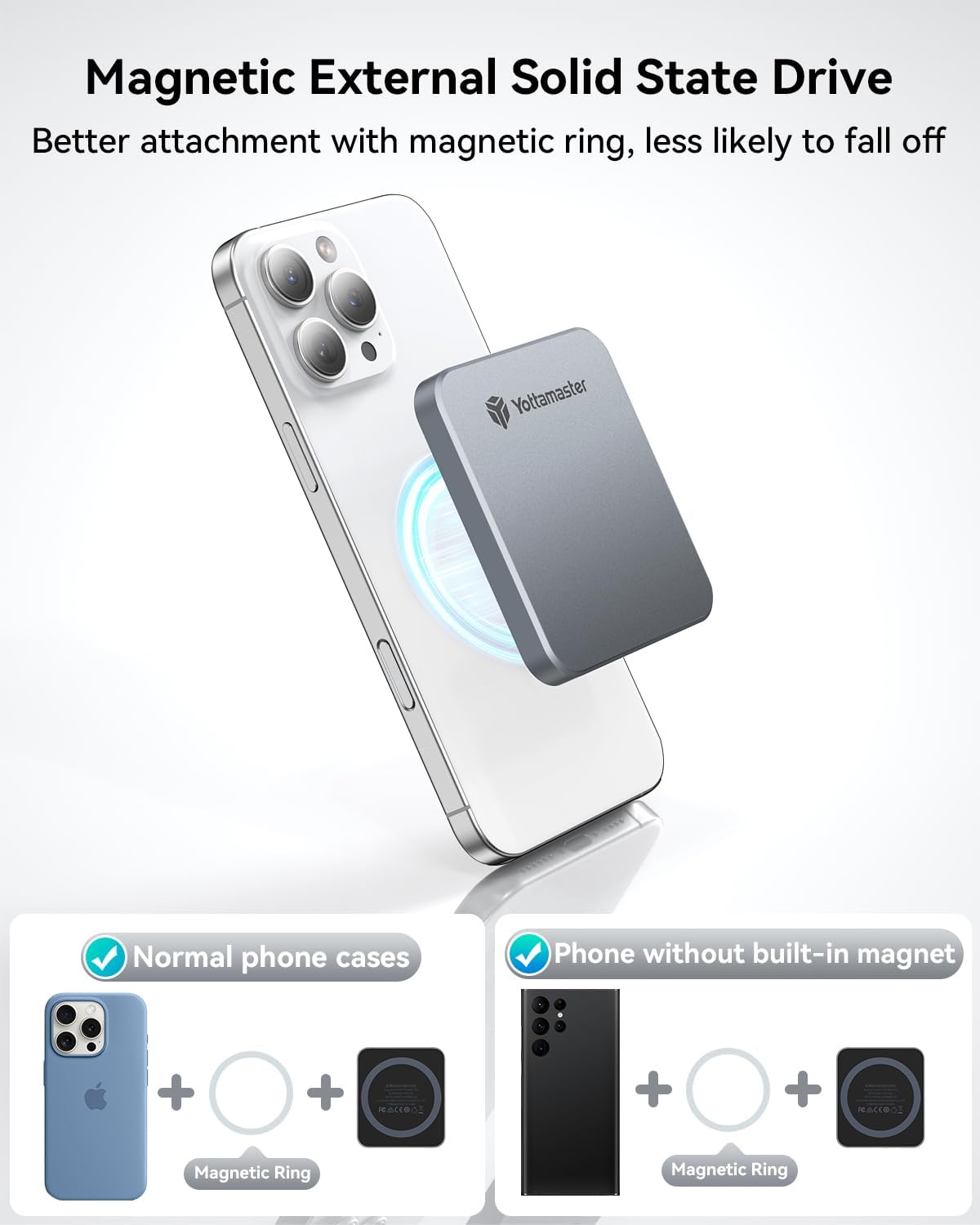 【Magnetic Design】Magnetic pssd can be directly attached to iPhones and phone cases with MagSafe support, and it also includes a magnetic ring for attachment to devices and cases without built-in magnets. This makes it the ideal choice for mobile photography enthusiasts, allowing you to store a large number of high-resolution photos and videos anytime, anywhere, combining portability and efficiency perfectly.!!Note: When using the PSSD with a phone case, it is recommended to use the included magnetic ring to prevent detachment due to insufficient magnetic force.
